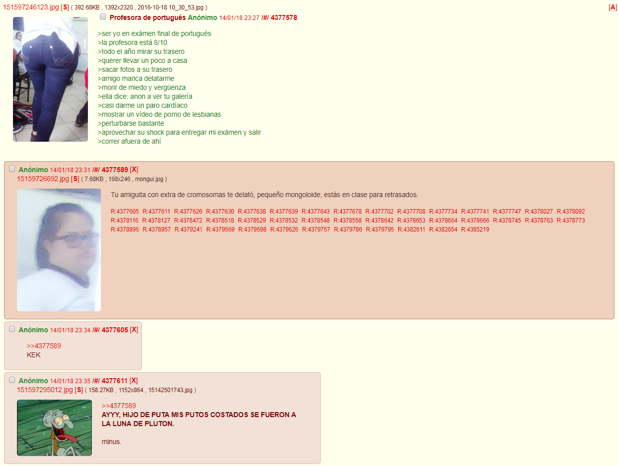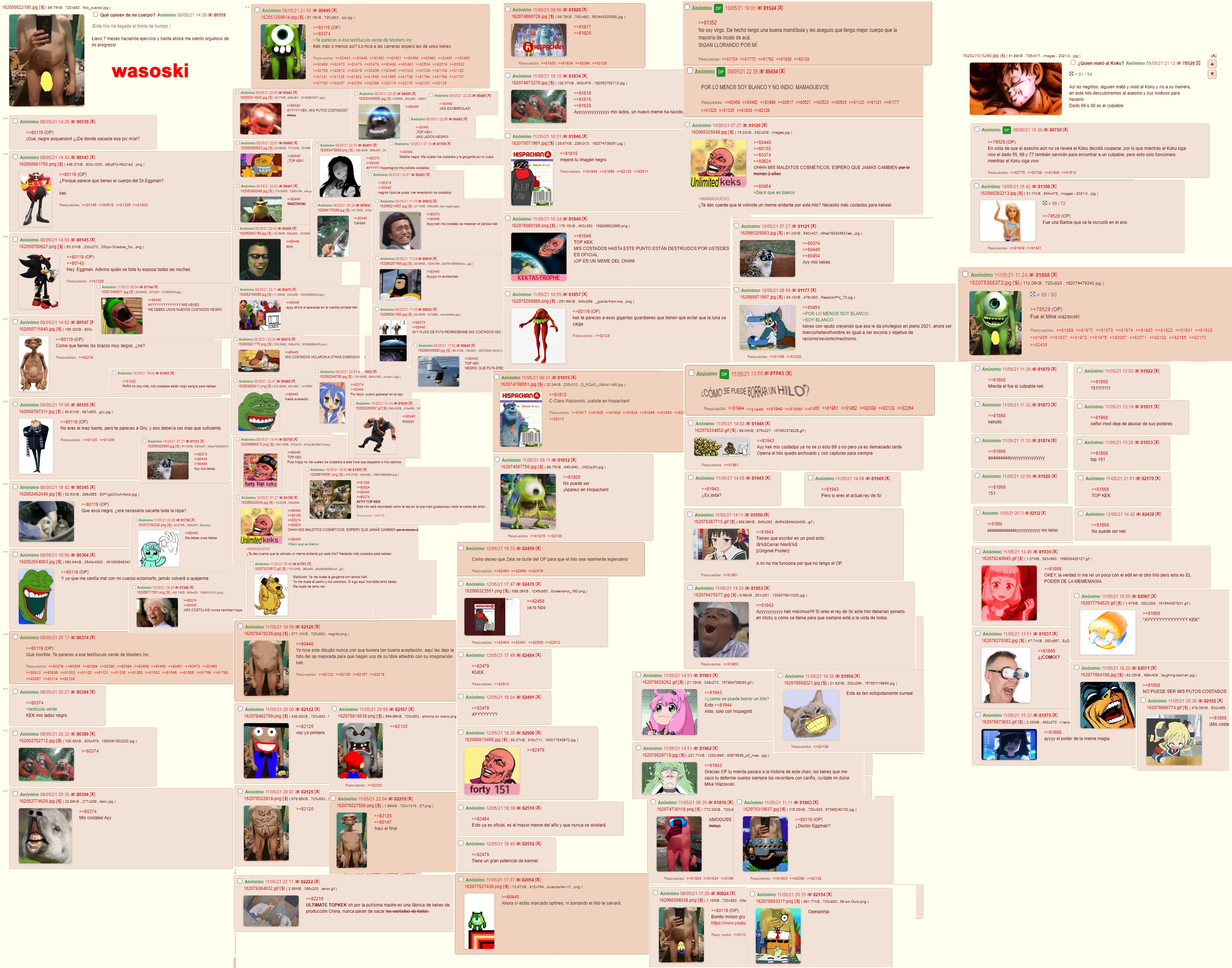 No me acuerdo si era en el viejo hispachan o en algún otro chon, pero hubo una ocasión donde un cabrón subió una foto de su cuerpo en un espejo en el tablón de salud y ejercicio. El pobre diablo estaba construido de la verga y le terminaron haciendo varios edits, recuerdo uno en especial de mike wazowski, ojala alguien tenga las caps
